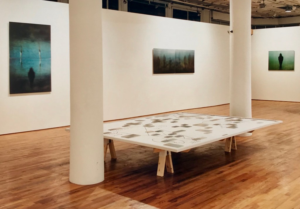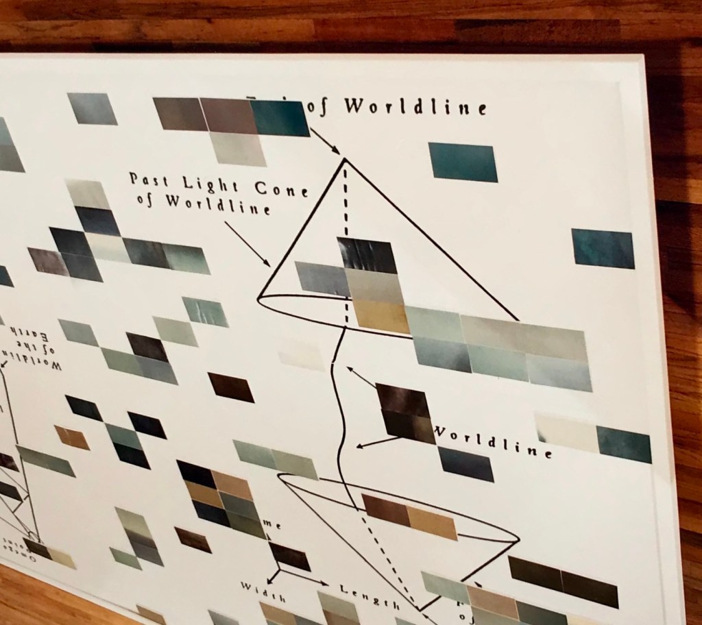 The diagrams on a platform, with a grid drawn for the invitation photo inserts that made all visitors become a part of the exhibit at TZ’ Art, NYC
